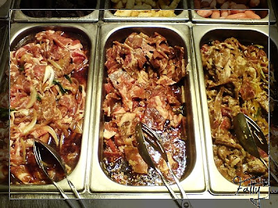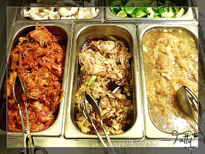 食材為自助式取用,除基本牛羊豬雞醃肉片外,還有銅盤烤肉中罕見的羊小排、豬小排、牛小排,全部貼心未帶骨,肉類選擇硬達九種之多。