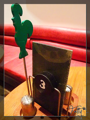 不愧是人氣餐廳,排有段時間才入座。帶位時,服務生手上會拿隻雞,然後插在你桌上,點完餐後,必須先到櫃台結帳。我以為這雞是憑證,所以順手拎著去付錢,結果櫃台說,牠只是代表本桌有人,不用牽著四處遛的。(羞)