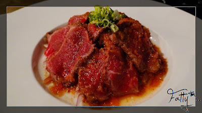 微烤日式生牛肉佐紫蔥特製醬,生牛肉片裹著洋蔥,搭配酸醬汁,清爽開胃,這道好。
